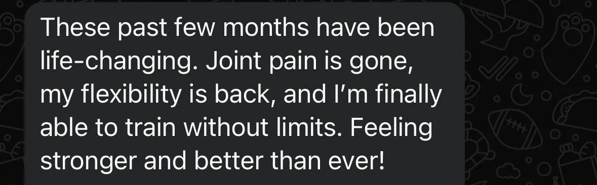 If you’re dealing with chronic pain, an old injury, or want to take your performance to the next level, personalized coaching can be a game-changer. I specialize in helping clients move past pain and build strength through tailored programs. Book a free call with me, and we’ll discuss your goals and how to achieve them.